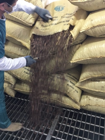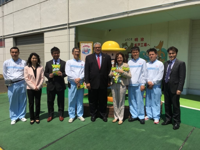 4月25日(火)、明治坂戸工場(埼玉県)にドミンゲス駐日大使、サラディン駐日ドミニカ共和国大使館公使参事官と共に行って参りました。同社はドミニカ共和国産カカオを利用したチョコレートの生産を行っており、その生産現場の視察をして参りました。一番印象的だったのは、カカオが積まれた袋が破かれ、発酵済のカカオ粒が生産ライン手前の貯蔵庫に一気に流れ出すシーンでした。その他、同社マーケティングや工場長の方のご案内により、広大な工場の一部を見学させて頂きました。一般の方向けにもツアーは開催されているとのことですので、是非参加してみてください!