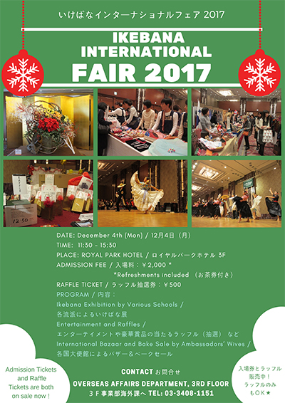 En pasado 4 de Diciembre, se realizó la Feria Internacional de Ikebana en Royal Park Hotel, Tokio. La feria fue organizada por la Fundación Sogetsu de Ikebana con objetivos de la popularización de arte ikebana y intercambio cultural. Además de la presentación de ikebana, había espectáculos y cabinas de embajadas en Tokio para mostrar y vender los productos especiales de cada país. La Sra. Nozomi Yamada (directora encargada asuntos culturales de la Asociación) participó a la feria con la Sra. Doña Alexandra Álvarez, esposa de honorable Embajador Extraordinario y Plenipotenciario de la República Dominicana, Sr. Héctor Domínguez. Este año, honorable Su Alteza Imperial, Princesa Hisako Takamado ha venido a la feria y nos ha preguntado acerca de los productos dominicanos en la cabina dominicana.