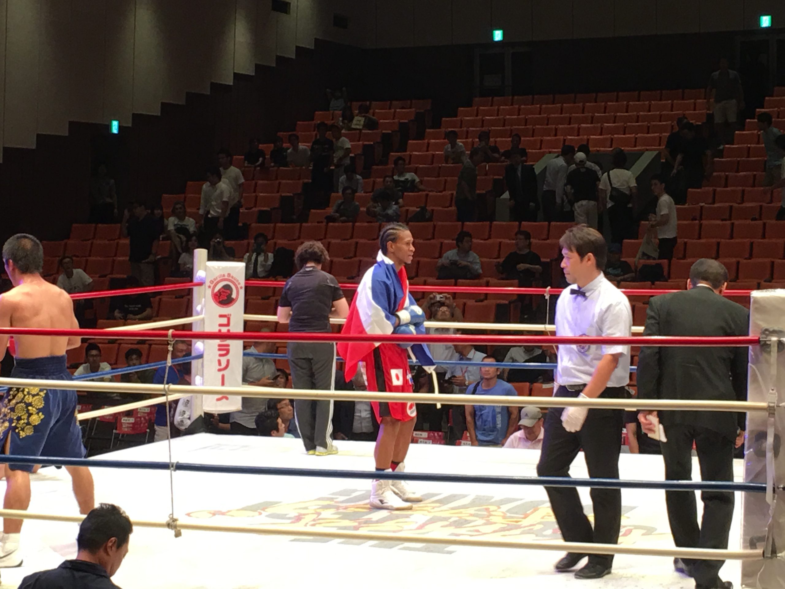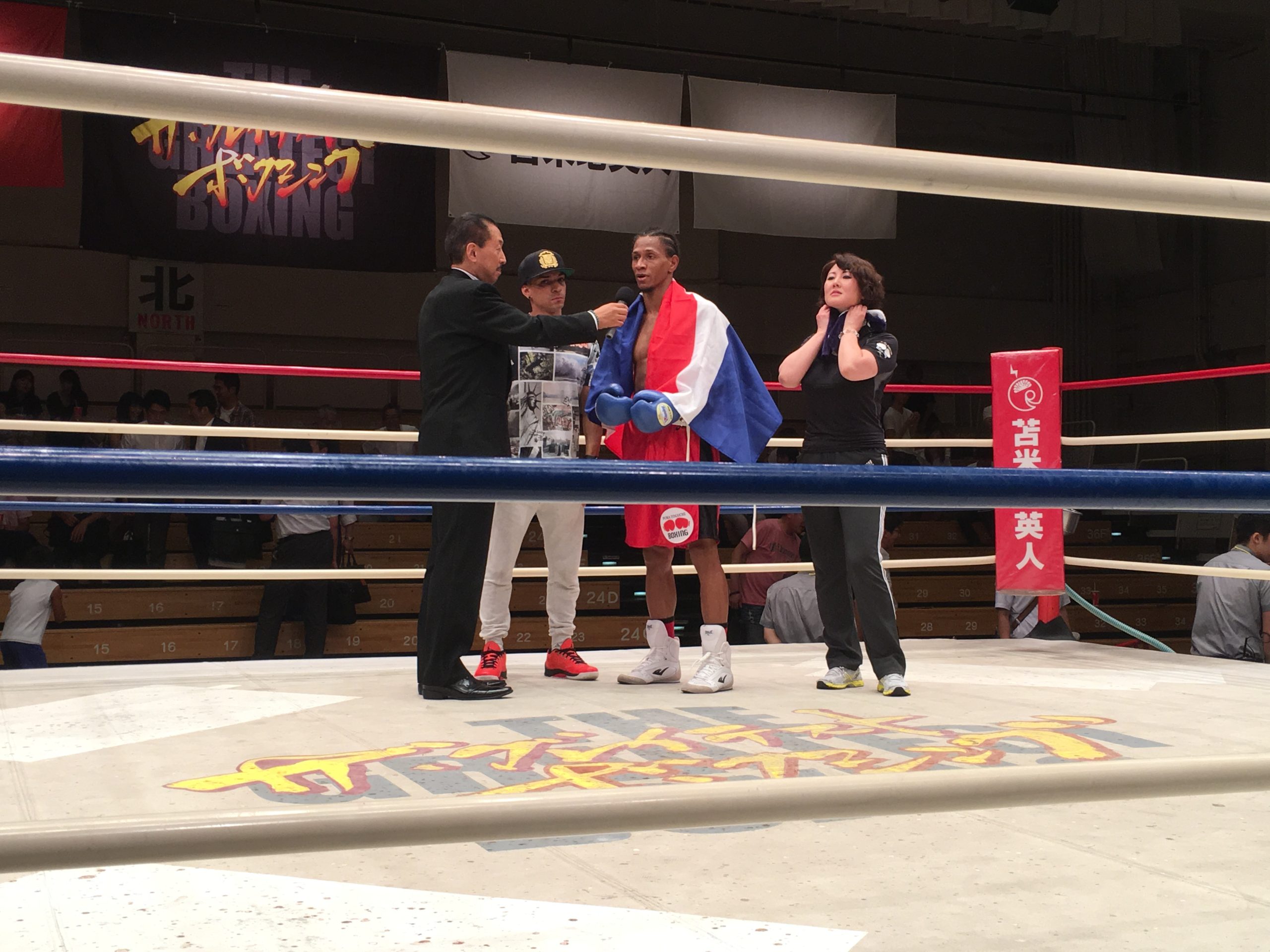 8月4日(金)に後楽園ホールで行われたThe Greatest Boxing Volume 28において、元ドミニカ共和国スーパライト級王者のデスティノ・ジャパン選手が2015年全日本ライト級新人王の中嶋龍成選手を5ラウンドTKOにて勝利致しました!私にとっては、同選手の勝ち負けよりも、普段から真面目に努力する姿勢、そして所属されているピューマ渡久地ジムの皆さんとのチームワークの方が印象に残りました。本試合の勝利により、デスティノ選手は日本スーパーライト級1位、東洋太平洋スーパーライト級9位となり、日本チャンピオンや世界戦などが見えてきました。次の試合は12月を予定しているとのことですので、是非皆さんで引き続き応援しましょう!!