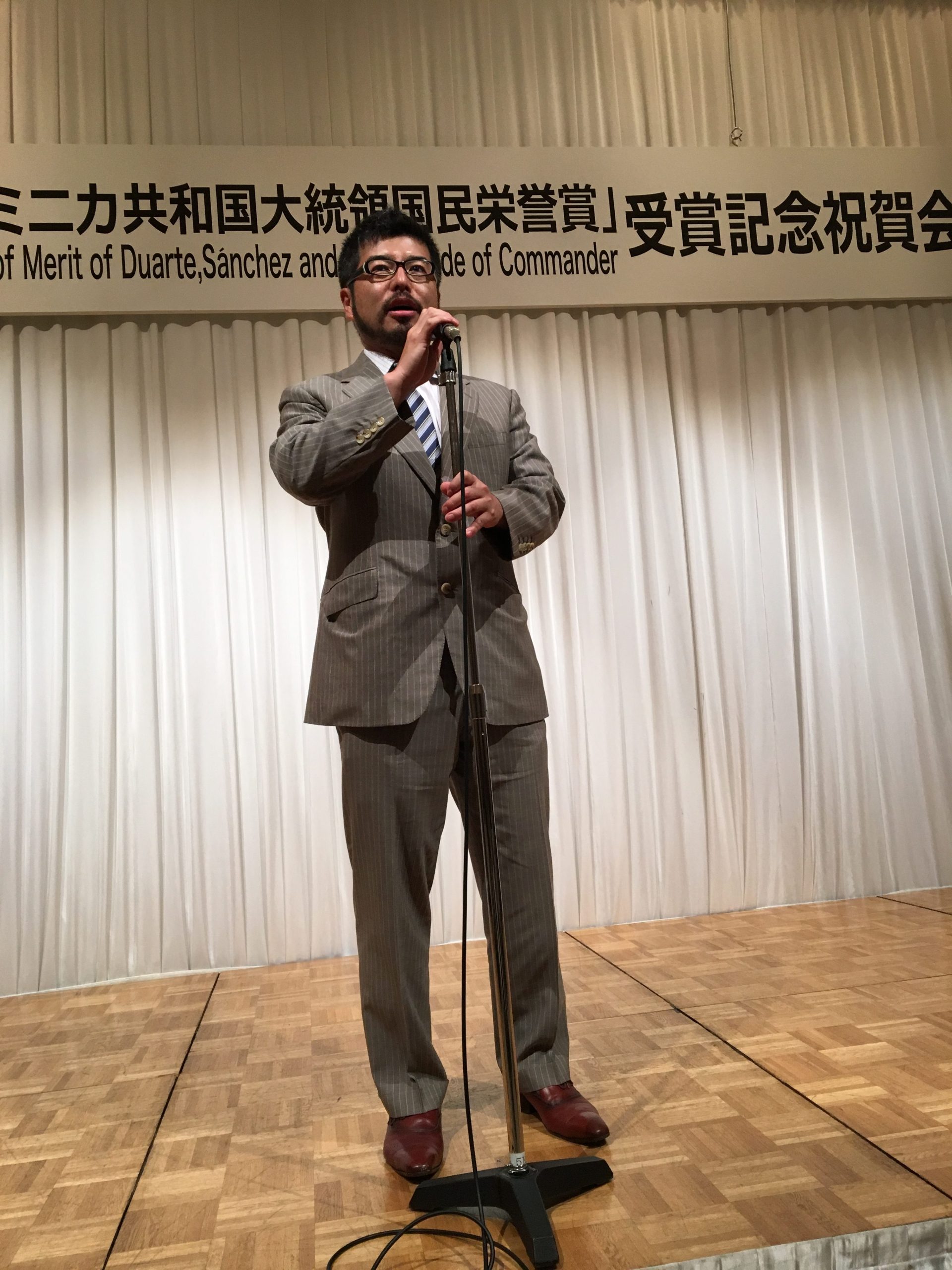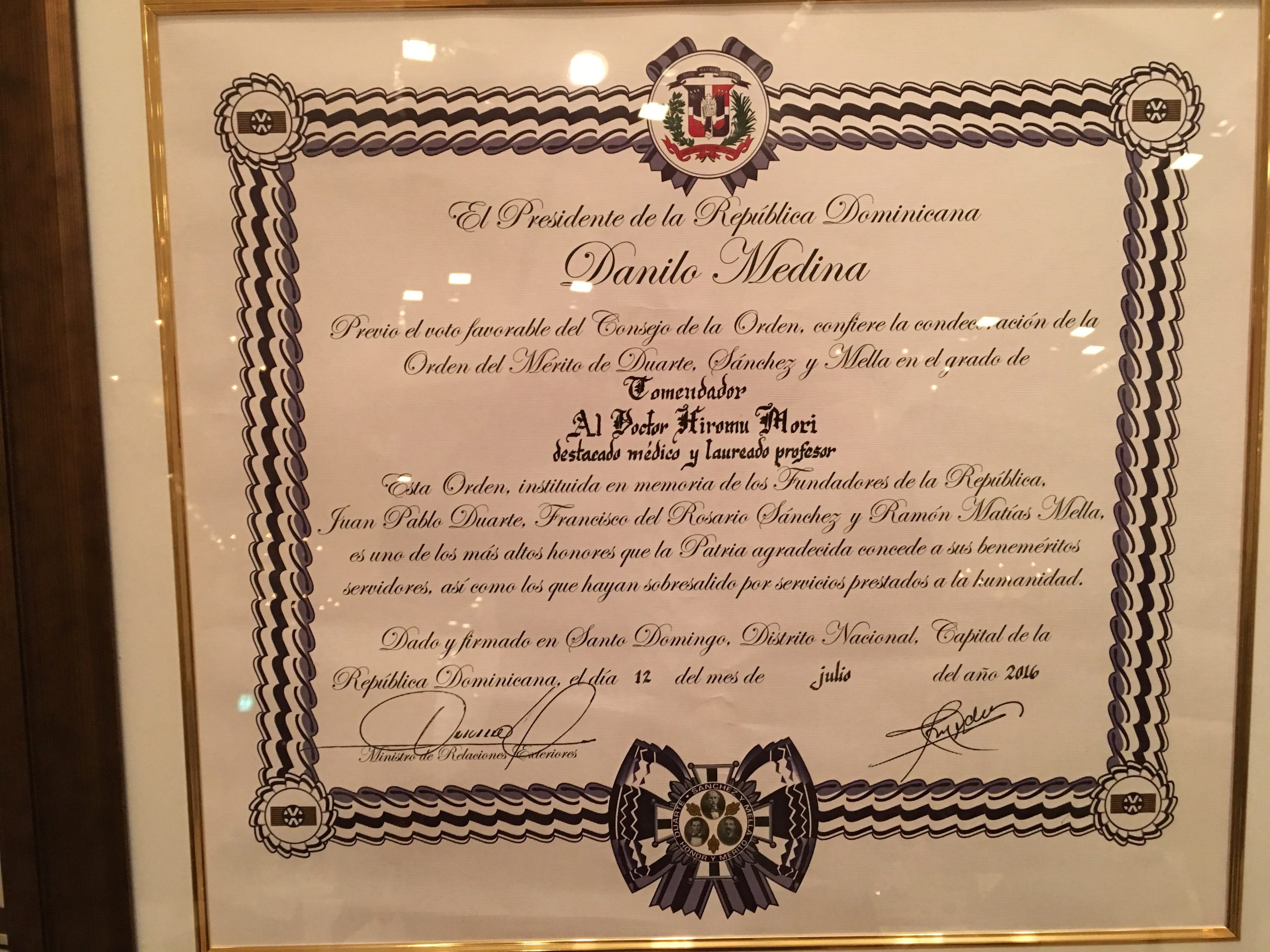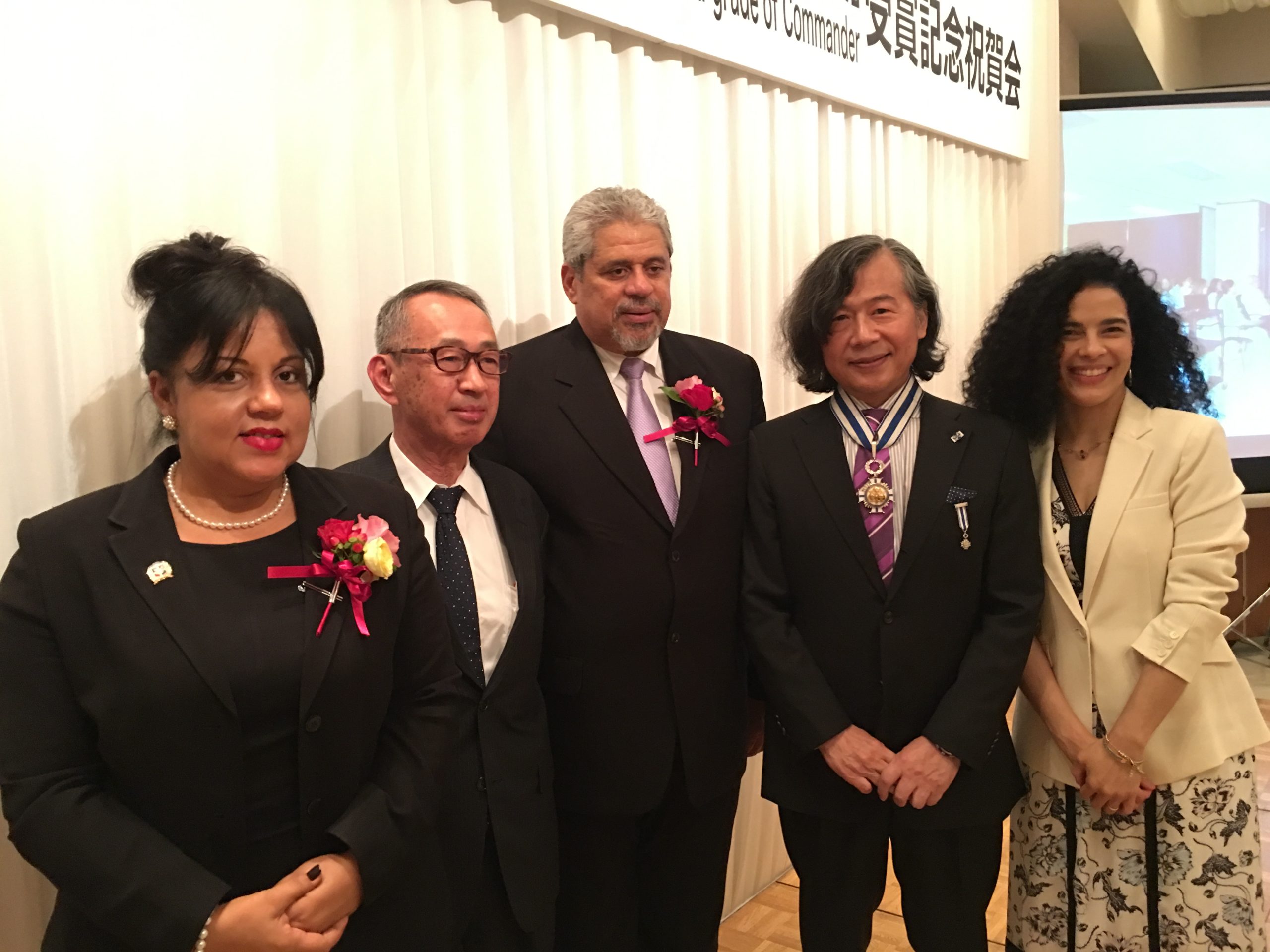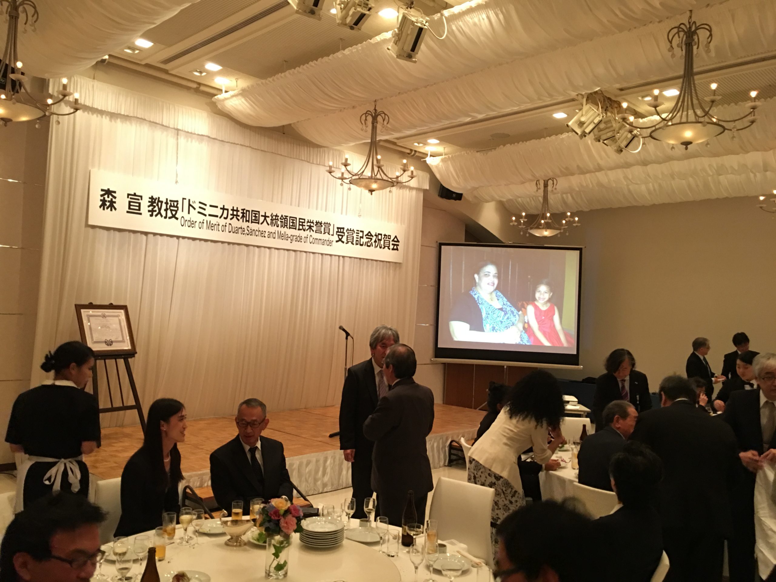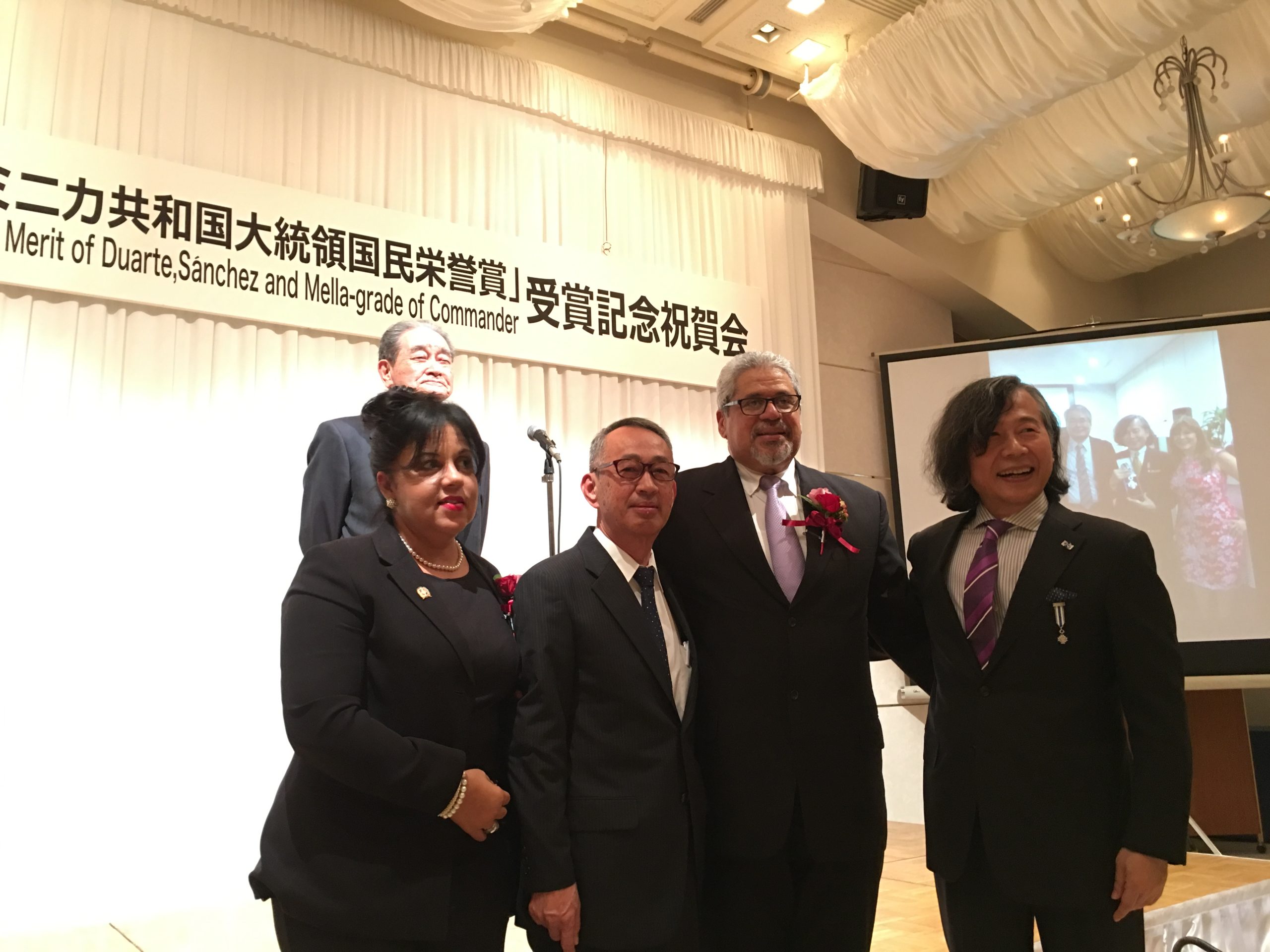 En 4 de Octubre, participamos a la recepción para celebrar el otorgado de Orden al Mérito de Duarte, Sánchez y Mella (Comendador) a Dr. Hiromu Mori por el gobierno dominicano sobre su cooperación médica a dicho país por más de 25 años con el Señor Embajador Domínguez y su esposa.