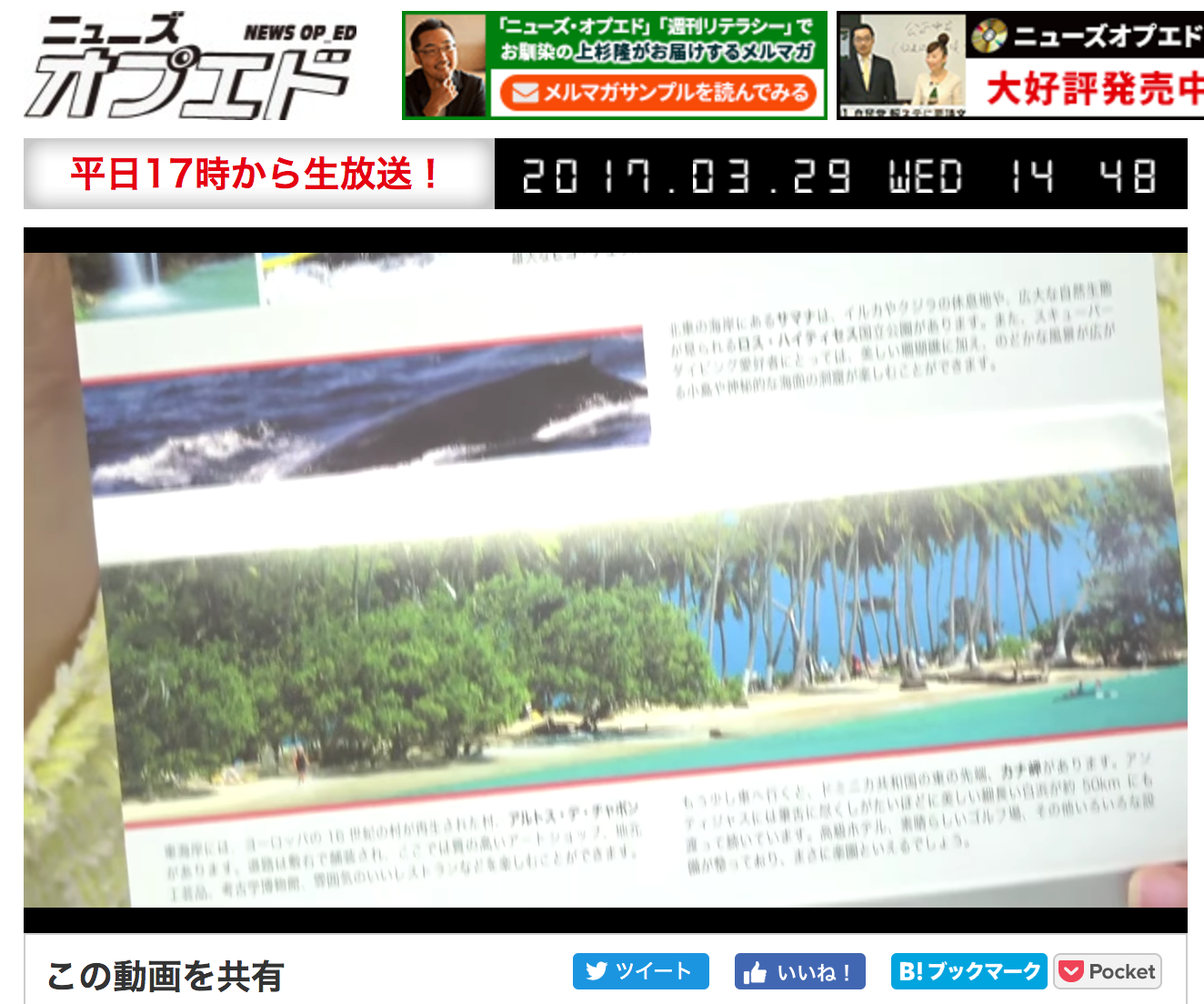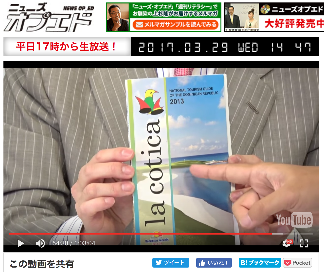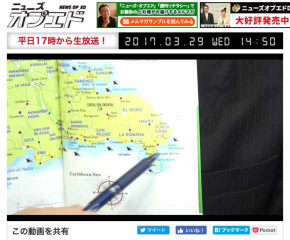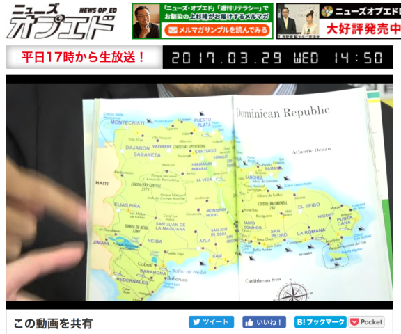 去る3月28日、2016年の都知事選にも出馬されたジャーナリストの上杉隆さんがキャスターを務める「ニュースオプエド」(インターネットTV)に出演させて頂き、ドミニカ共和国についてお話する機会に恵まれました。冒頭、時事問題についてのコメントを求められた後、「特集:ドミニカ共和国からみた日本」との題材で、両国間関係、ドミニカ共和国の人々、食事、観光情報などについて上杉キャスター、義山アシスタント、佐野秀光・支持政党なし代表のお三方と楽しくお話させて頂きました。上杉キャスターからは、ゴルフ場についての質問や、ドミニカ共和国移住50周年の記念式典に招待され、ドミニカ共和国を訪問した際のエピソードについてお話がありました。また、Twitter経由で視聴者の皆様から2件の質問を頂きました(ドミニカ共和国の産業及びドミニカ共和国への行き方)。本機会は、私が普段からお世話になっている「日本政策学校」のご厚意により提供されたものであり、ドミニカ共和国をアピールする機会を与えて頂いた関係者の皆様に心より御礼申し上げます。