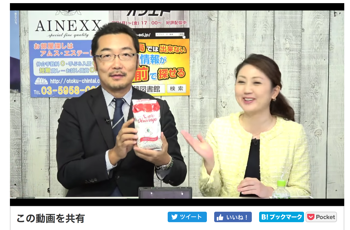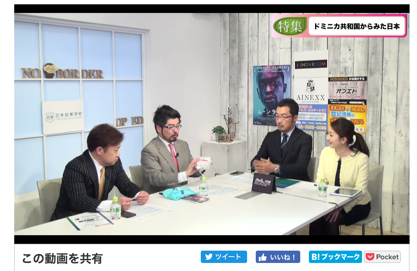 En 28 de Marzo, tuve oportunidad para presentar la República Dominicana en la programa de televisión (de internet), se llamaba “News Op-Ed”, establecido por Sr. Takashi Uesugi, un periodista y candidato por la elección del gobernador metropolitano de Tokio en 2016. Después de hacer comentos sobre temas actuales, presenté el pueblo dominicano, incluido la gastronomía, gente y la información sobre turismo al Sr. Uesugi, Sra. Nozomi Yoshiyama, asistente de la programa y Sr. Hidemitsu Sato, el presidente del grupo politico, “Ningún partido político (Shiji Seito Nashi).” Además de su pregunta personal a los campos de golf en la república, Sr. Uesugi reconoció su episodio de participar la ceremonia de 50 años de los inmigrantes japoneses a la RD en 2005. También, había dos preguntas acerca de la RD (industria y cómo llegar a la República Dominicana desde Japón) vía Twitter. Esta oportunidad fue ofrecida por la cortesía de la Escuela de Política de Japón (Japan School of Policy Making: Nihon Seisaku Gakko) donde estoy aprendido las políticas japonesas. Agradezco a aquellos que me dieron una oportunidad única para anunciar República Dominicana.