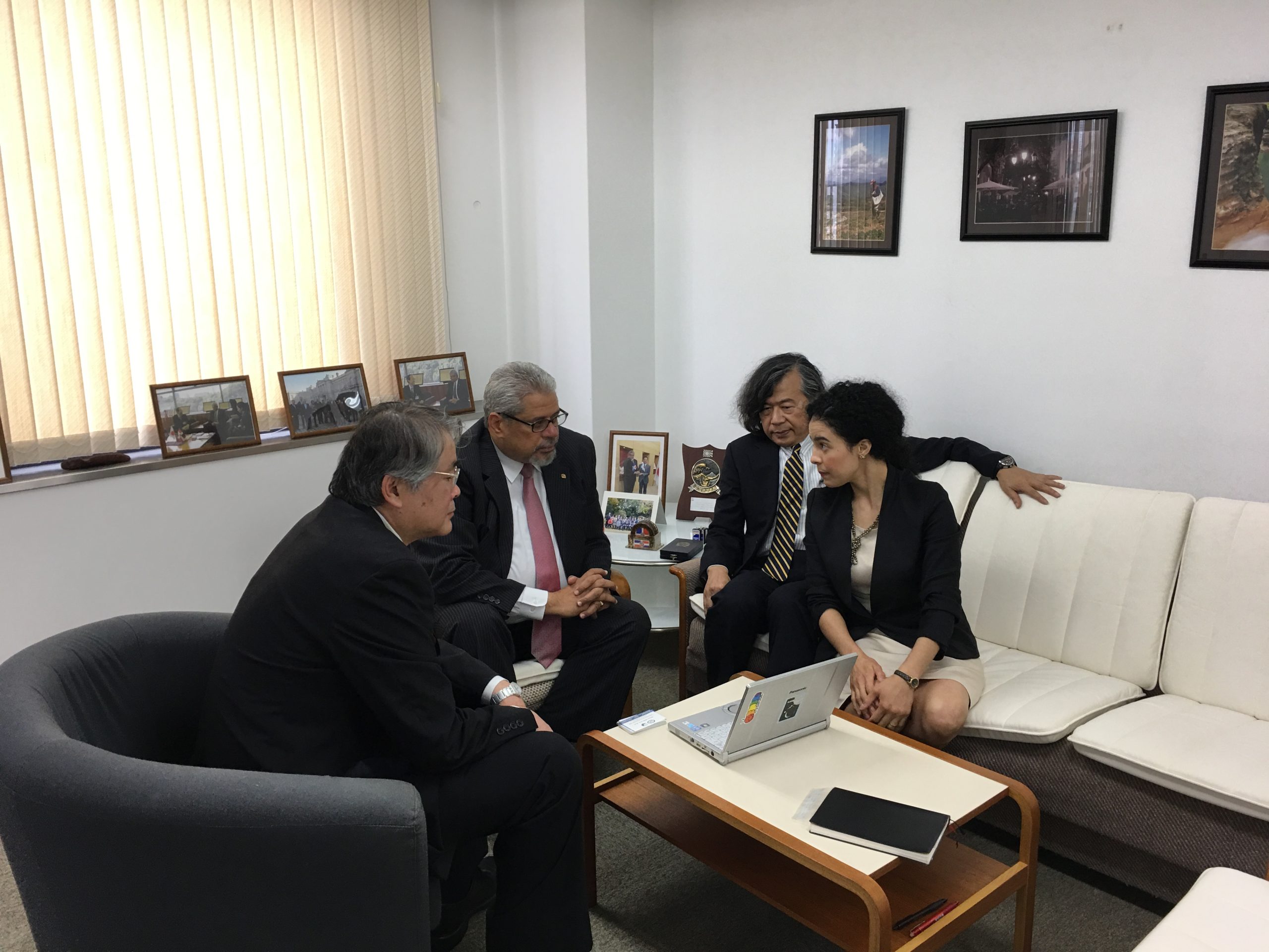 面会の席上ドミンゲス大使からは、大分大学の約25年に渡る協力に対し謝意が示されたほか、新しい医療教育プロジェクトの実施に関し、大使自ら日本・ドミニカ共和国両政府に対し要請を行うとのお言葉がありました。森教授からは、過去の医療協力プロジェクトに関する説明のほか、来る10月4日に大分市内にて行われるドゥアルテ=サンチェス=メジャ勲章受章記念式典に、ドミンゲス大使及び鈴木代表理事をご招待したいとのお話がありました。
