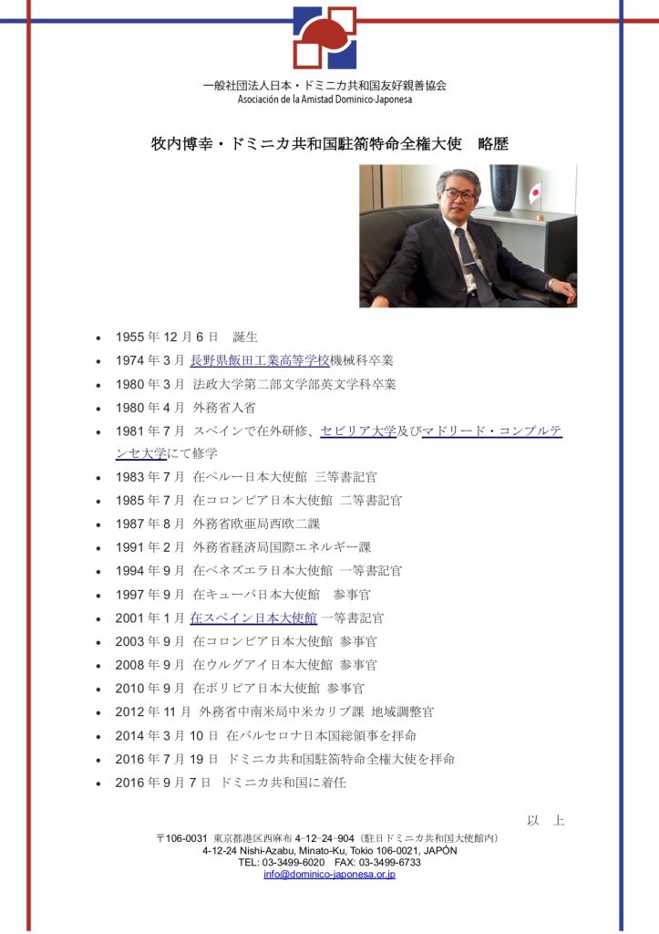 【Aviso】En 24 de abril, realizamos la primera sesión de “Dominican Speakers.” El primera orador es el Sr. Hiroyuki Makiuchi, el Embajador extraordinario y plenipotenciario de Japón en la República Dominicana. El Sr. Embajador va a hablar acerca de sus carrera profesional como diplomático en America Latina y sus actividades en la República Dominicana como Embajador. Servimos comida dominicana (bandera) con bebidas. El precio es: 4,000 yenes (socios de la Asociación), 5,000 yenes (regular). Para participar, clic la página de Facebook o escribe a info@dominico-japonesa.or.jp