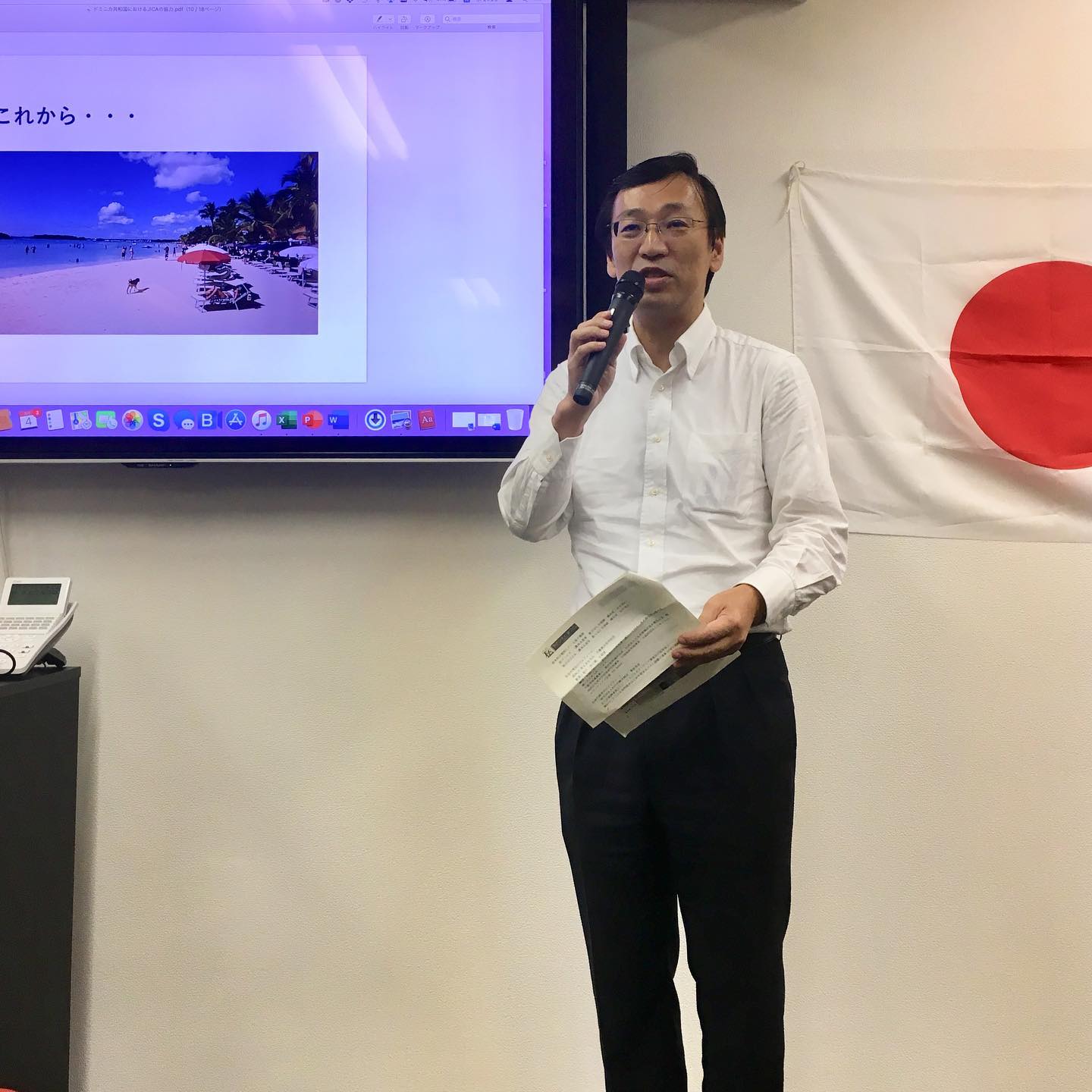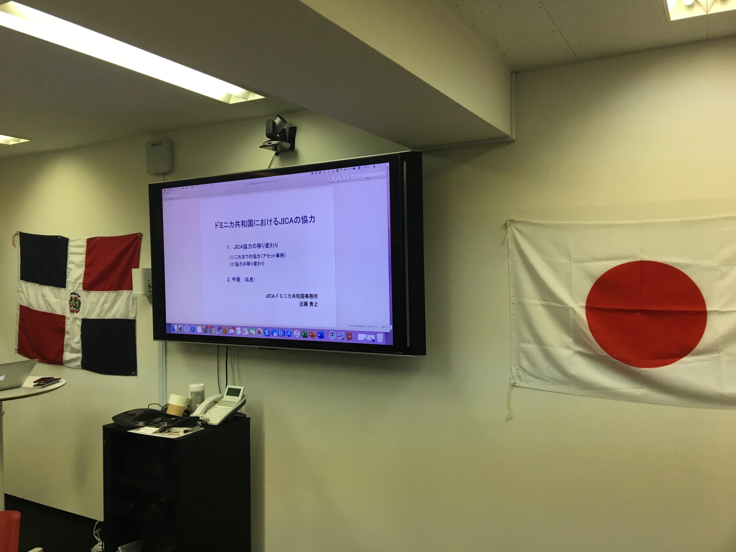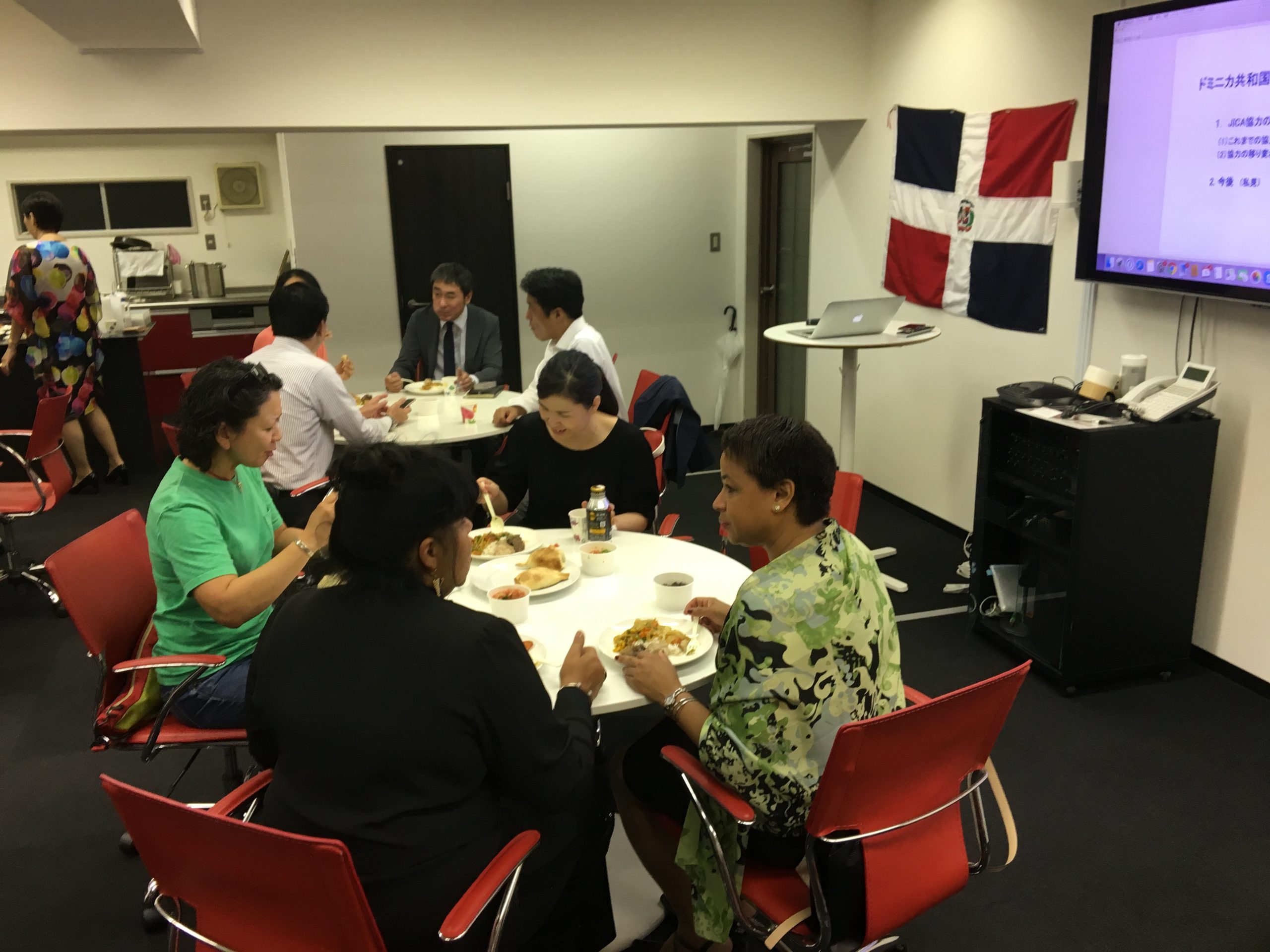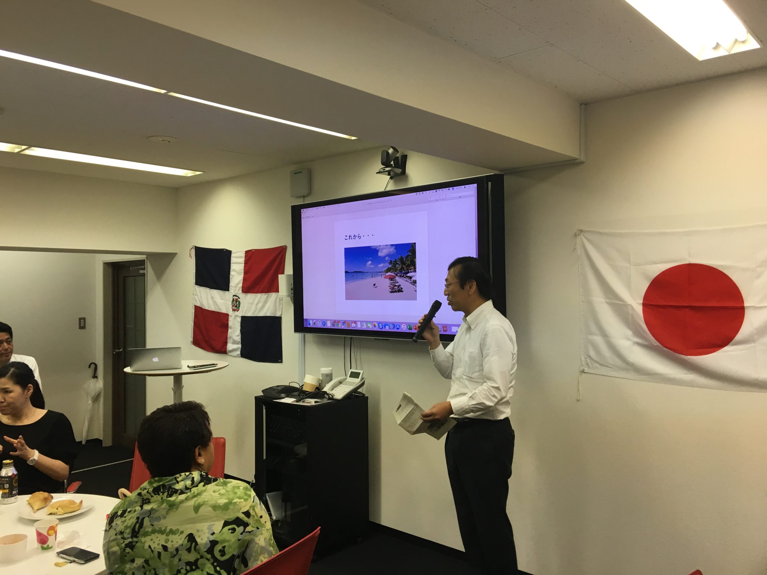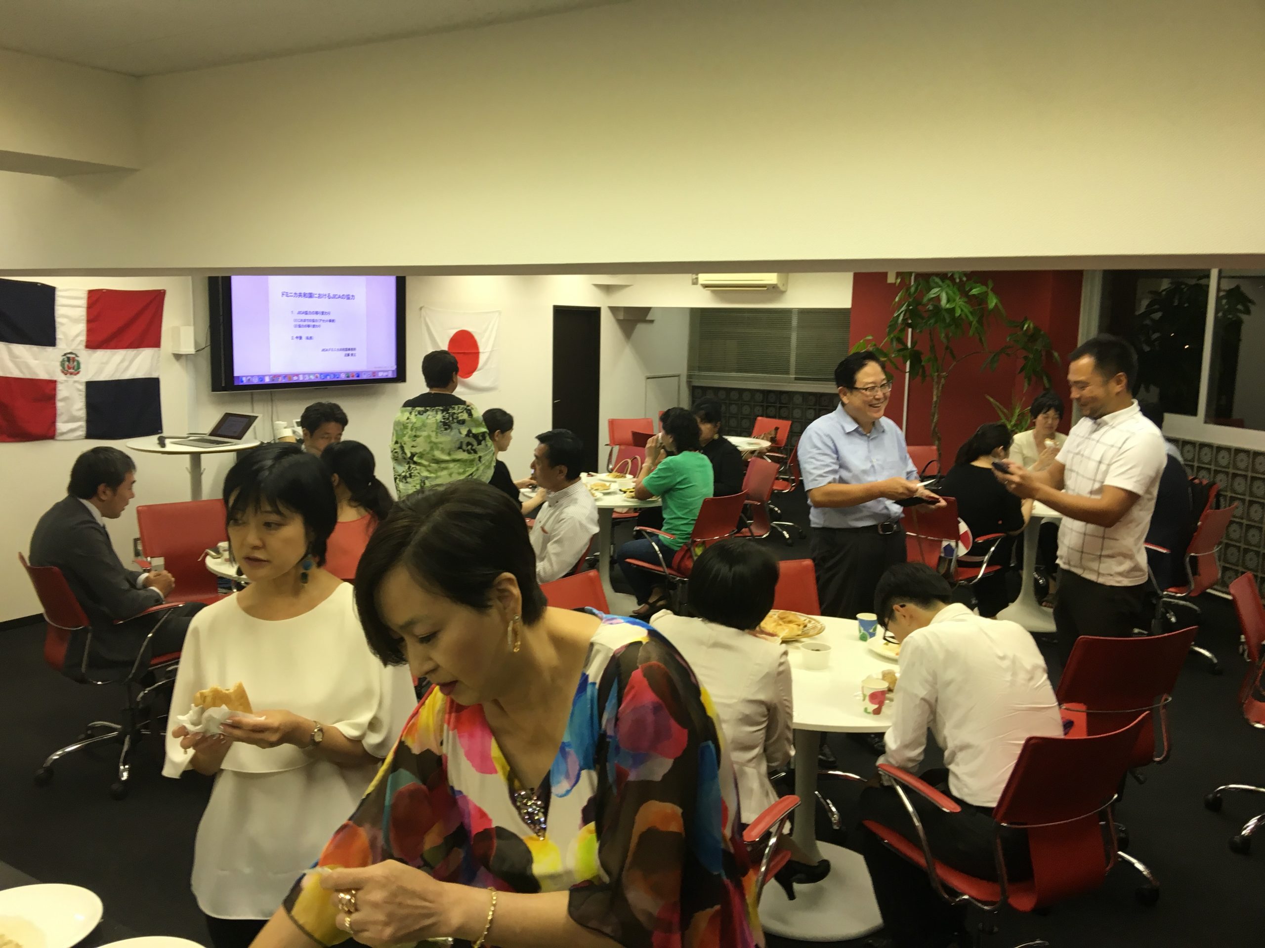 9月4日(水)、近藤貴之JICAドミニカ共和国所長をお招きし、「第4回ドミニカン・スピーカーズ」を開催致しました(山田前所長、近藤様をご紹介頂き誠に有難うございました)。平日の夜にも関わらず、アレクサンドラ・アルバレス駐日ドミニカ共和国大使夫人や松戸市役所の職員の方々も含め、計20名の方にお越し頂きました。近藤所長からは、日本(JICA)の有償・無償、技術協力からボランティアの派遣に関わる様々なタイプのプロジェクトについてご説明頂きました。印象深かったのは、ドミニカ共和国の経済発展に伴い、支援内容も変化して行ったことでした。例えば、1990年代初期からは、消化器医療関連や日本・ドミニカ共和国友好医療教育センターの建設や算数教育プロジェクト、農業開発などの「プライマリーレベル」の協力を行い、最近はプラスチックゴミの廃棄や首都の交通渋滞、防災や地域開発まで「グローバルな共通の課題」について協力を行っているとのことでした。また、ドミニカ共和国コンスタンサ市に「20世紀梨」の生産協力を行っている松戸市の白井文化観光国際課長からも簡単なプレゼンテーションを行って頂きました。最後にアルバレス駐日ドミニカ共和国大使夫人から日本のドミニカ共和国に対する協力につき、謝意が述べられました。皆様から多くの質問が出たように、ドミニカ共和国を国際協力の観点から知って頂く、非常に貴重な機会であったと思います。ご帰国の翌日にも関わらずご登壇頂きました近藤所長に心より御礼申し上げます。最後にお料理を出して頂いたEduardo Ferradaさん、有難うございました。
