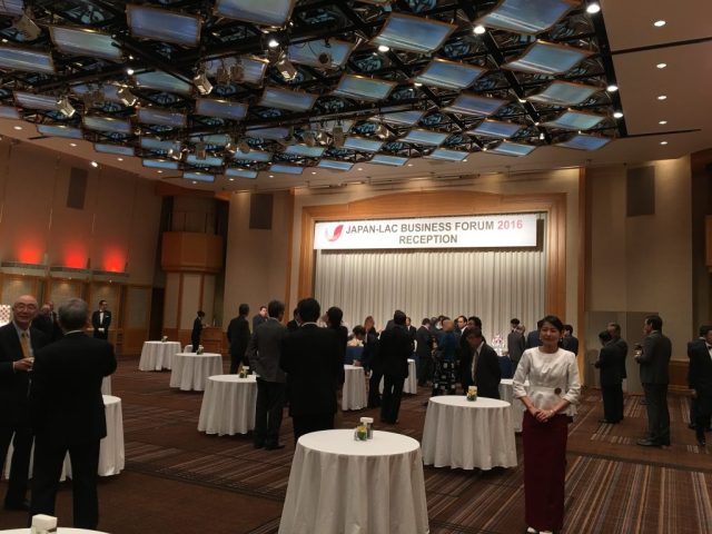 10月31日〜11月1日に行われたJapan-LAC Business Forum 2016の歓迎レセプション及び一部のセッションに参加してきました。本イベントはIDB(米州開発銀行)が主催し、経済・貿易、インフラ・社会投資、そして人工知能やIoTなどの新たな技術の分野において、如何に日本とラテンアメリカ諸国間が手を組み、関係を発展させるかにつき、有識者を招いて様々なプレゼンテーションやパネルディスカッションが行われました。また、ドミニカ共和国を含むラテンアメリカ諸国の起業家が来日し、日本企業の視察や日本企業との人脈作りに勤しんでおりました(写真は歓迎レセプションでの一コマ)。