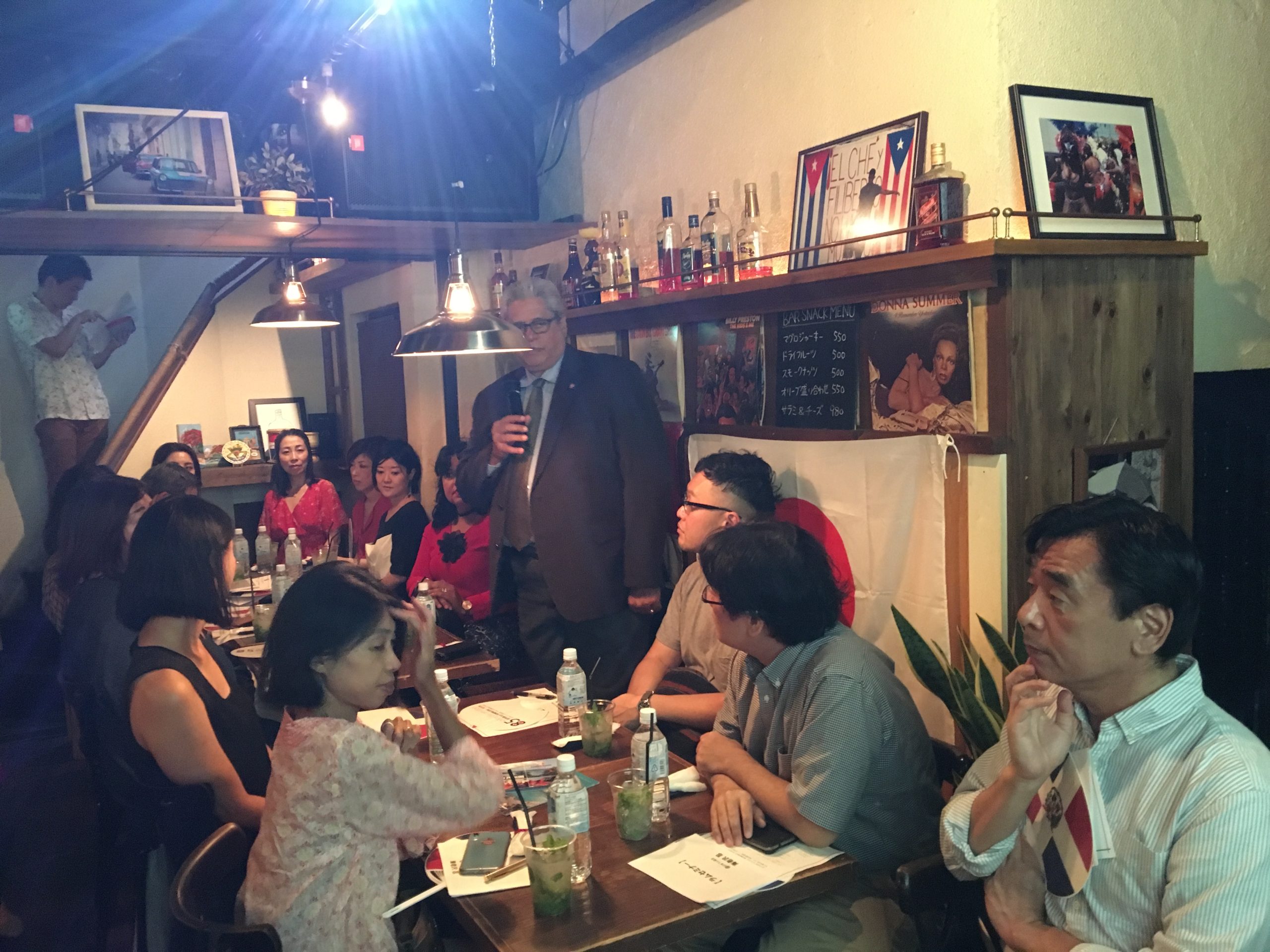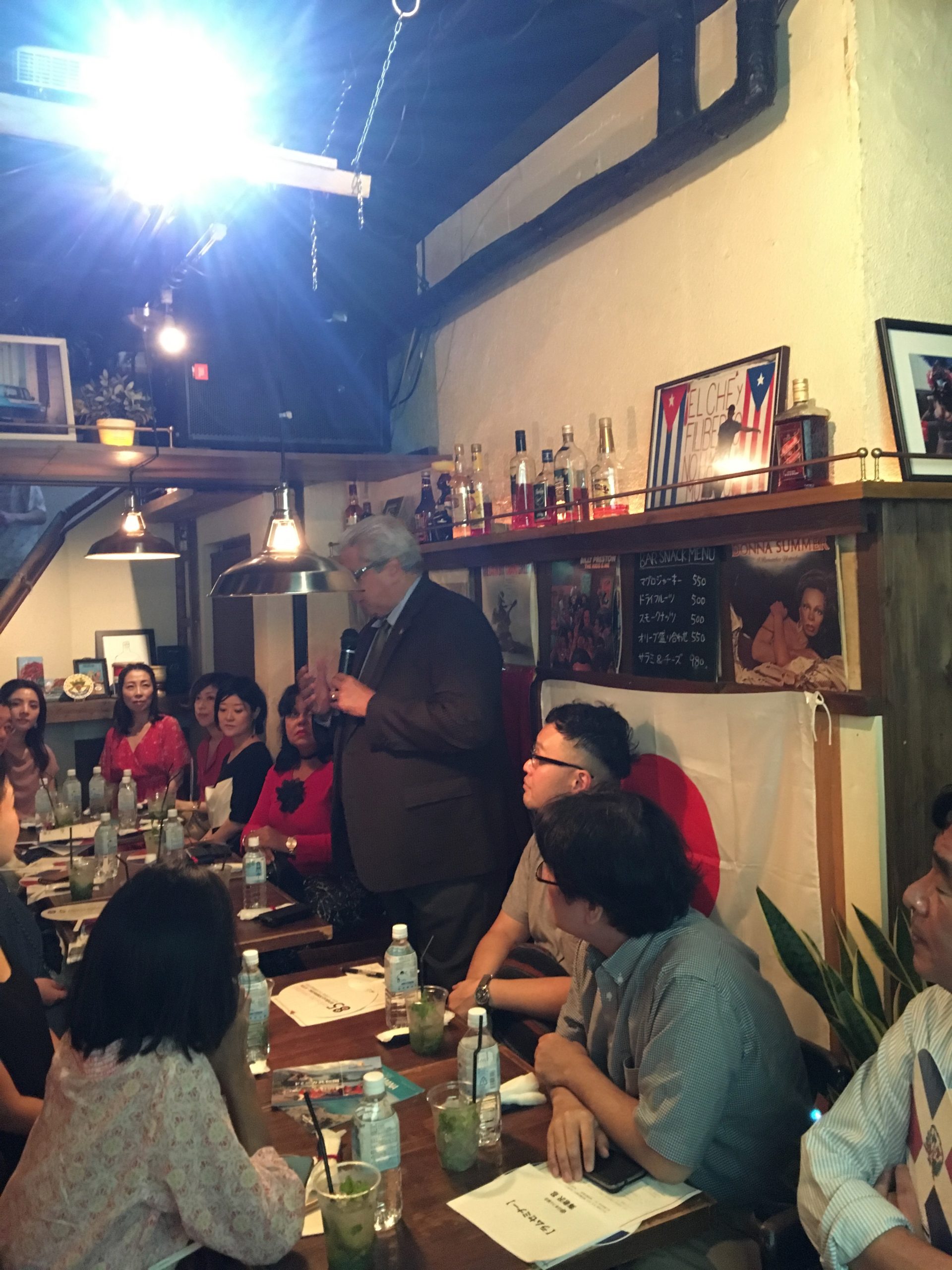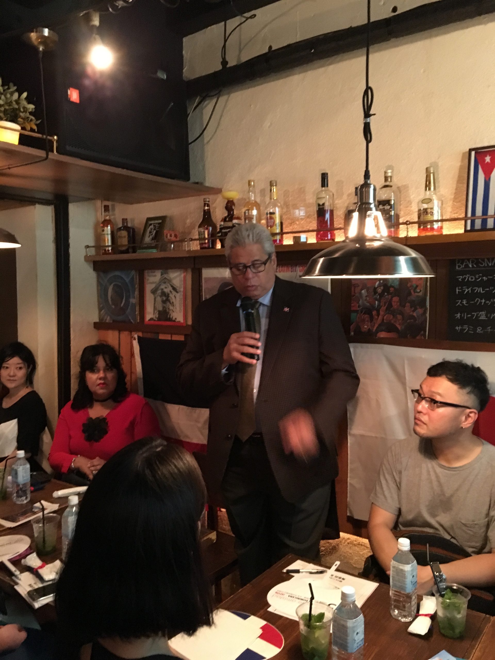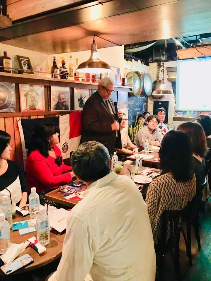 El pasado 23 de Septiembre, celebramos la primera sesión de “Gastronomía Dominicana” en ARIAPITA RUM & PUNCH bar con 26 participantes, incluido el Sr. Héctor Dominguez, el Embajador Extraordinario y Plenipotenciario ante la República Dominicana en Japón y Doña Alexandra Álvarez y ex-representante residencial de JICA en la República Dominicana, el Sr. Akihiko Yamada.  Después de los saludos de apertura de Embajador Domínguez, el Sr. Wataru Suzuki, el Presidente de la Asociación de la Amistad Dominico-Japonesa brevemente presentó información básico acerca de la RD. Como un presentador principal, el Sr. Shinobu Ebinuma, el dueño del bar y el Presidente de R.U.M. JAPAN nos dio una serie de seminarios sobre ron que incluyeron sus antecedentes históricos, diferentes tipos, formas de destilación y la mejor forma de beber.  También la Sra. Shiho Sugure de Lead-off Japan, Inc. y el Sr. Takuya Kobabashi de Musashi-ya, Inc. que nos han explicado acerca de sus ofertas de diferentes tipos de ron dominicanos.  Los participantes se han disfrutado diferentes tipos de ron dominicanos con las comidas ligeras dominicanas como empanadas, guacamole y chips de plátano.   Unos puntos importantes de la presentación por el Sr. Ebisawa eran que hay tres tipos de rones (blanco, oro y negro) y cada ron tiene características diferentes que son de formas diferentes de destilación desde ex-potencias coloniales, como Reino Unido (Scottish whiskey: rum), Francia (Coñac: rhum) y España (Jerez: ron).  Muchas gracias por sus colaboración a ARIAPITA RUM & PUNCH, el Sr. Ebisawa, la Sra. Sugure, el Sr. Kobayashi y todos participantes.  En el futuro, nos gustaría aumentar nuestro conocimiento de “gastronomía dominicana” con ustedes a través de los clases de puros, café, chocolate y lección de cocina dominicana!  ¡Nos vemos en el próximo evento!