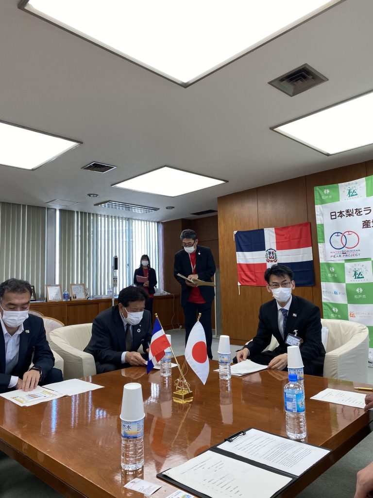 去る4月21日、松戸市市役所で「梨」プロジェクトの委嘱式が行われました。もともと2015年の9月に行った「駐日外交団ツアー」において、松戸市を訪問した当時のエルネスト・ペレイラ在日ドミニカ共和国大使館公使参事官(現駐イスラエル・ドミニカ共和国大使)が松戸の梨をドミニカ共和国を植えたいとのお話をされたところ、松戸市からドミニカ共和国への調査団派遣、同国農務省幹部の松戸派遣等を経て、本プロジェクトが始まりました。2021年にはJICAの草の根技術協力事業にも採用され、現地派遣員を経由して、まずは梨の栽培に全力を挙げます。本プロジェクトには松戸市文化観光国際課のほか、梨栽培、園芸、開発プロジェクト、国際交流の専門家が集まり、当協会は梨の商品化・ビジネス化にかかるマーケティングを担当します。今後ドミニカ共和国に渡航しての調査業務等も予定されておりますので、改めてプロジェクトの進捗について報告させて頂きます。